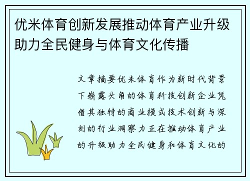 优米体育创新发展推动体育产业升级助力全民健身与体育文化传播